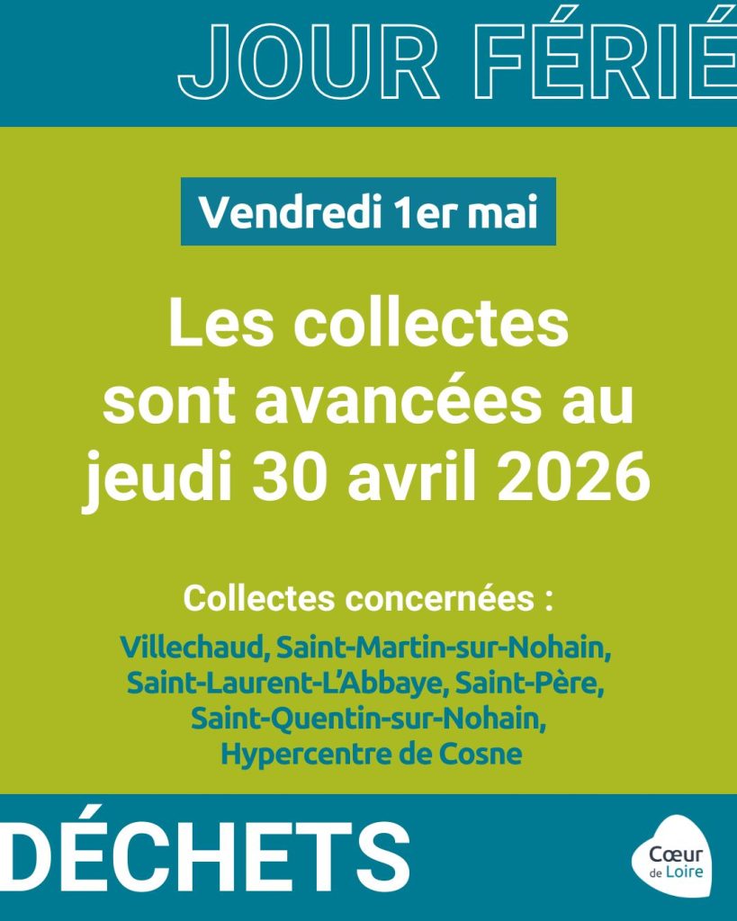 • Ramassage du TRI (sac jaune) : les collectes sont avancées au jeudi 30 avril pour Villechaud, Saint-Laurent-l’Abbaye, Saint-Martin-sur-Nohain, Saint-Père et Saint-Quentin-sur-Nohain.