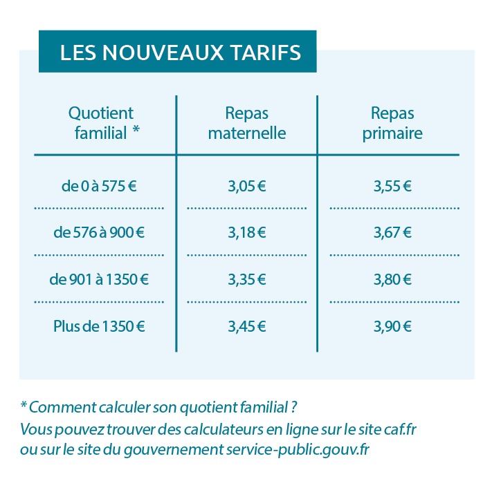À partir de janvier 2026, le tarif appliqué pour chaque repas dépendra de la tranche dans laquelle se situe le foyer, en fonction de ses ressources. Le règlement est disponible sur le Portail Famille.