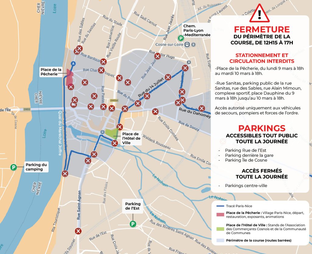 Pour garantir la sécurité des coureurs et du public, des mesures temporaires de circulation et de stationnement seront mises en place sur l’ensemble du parcours le jour de la course. Les informations pratiques concernant les secteurs concernés, les horaires seront communiqués en amont aux riverains et disponibles sur mairiecosnesurloire.fr et mairie-pouillysurloire.fr